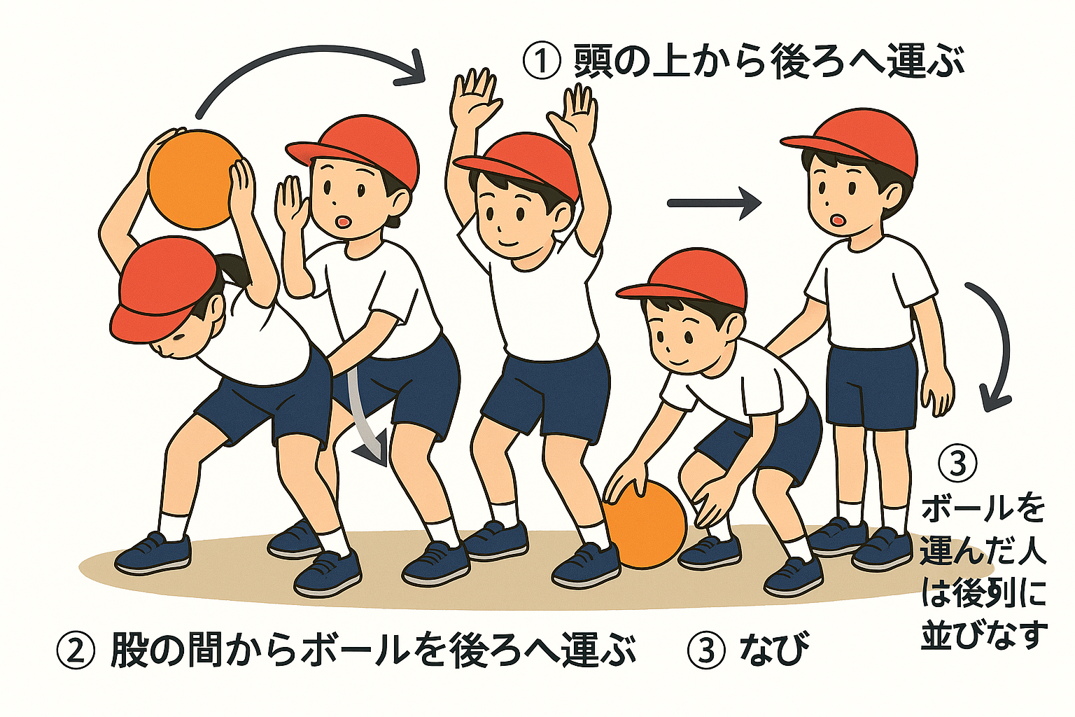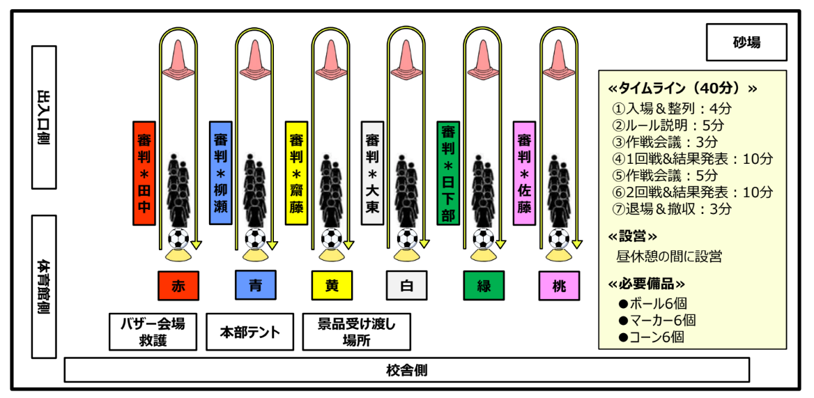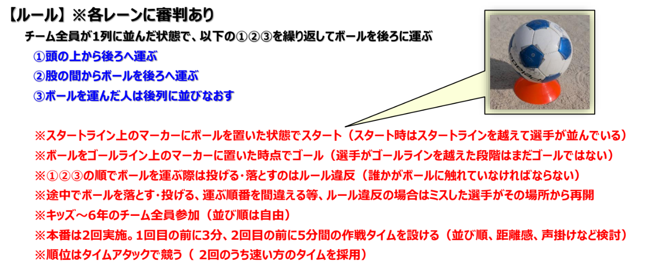 チーム対抗(全員参加)で以下のルールに従ってボールを運び、タイムアタックで順位を競う